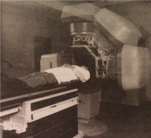 شکل ۱-۱۹٫ پرتو درمانی می تواند به شکل مؤثری، سلول های سرطانی را از بین ببرد. حین درمان، منبع اشعه به آرامی می چرخد تا تأثیر تابش اشعه بیشتر شود.به طور کلی، پرتو درمانی در مقایسه با جراحی ریشه ای، بدریختی های کمتری در ظاهر فرد ایجاد می کند، امّا با این حال ممکن است عوارض جانبی مشکل سازی مثل قرمزی و سوزش یا ضخامت پوست، اشکال در بلع، خشکی دهان، تهوع، اسهال، ریزش مو و کاهش توان جسمانی، ایجاد کند. شدت و وسعت این عوارض بستگی به محل تابش و میزان اشعه تابیده شده دارد.
